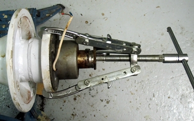 Puis l'arrache moyeu permet de pousser le tube vers le haut, hors de la cage à roulement sous la colonne de barre.