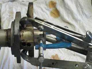 Arrachage du roulement inférieur. On voit le roulement particulièrement rouillé et détruit. Il est difficile à sortir, même avec l'arrche moyeu.