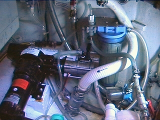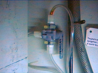 L'eau de mer à traiter arrive par un passe coque sécurisé par une vanne, situé sous l'évier. L'eau de mer rejetée est évacuée par le passe coque du lavabo de la salle de bain (suffisament loin du passe coque précédent). L'eau douce dessalinisée est stockée dans un jerrican de 10 litres, qui suffit à notre consommation de boisson. La pompe est fixée par 4 vis sur un bloc de bois collé à l'époxy dans la coque.