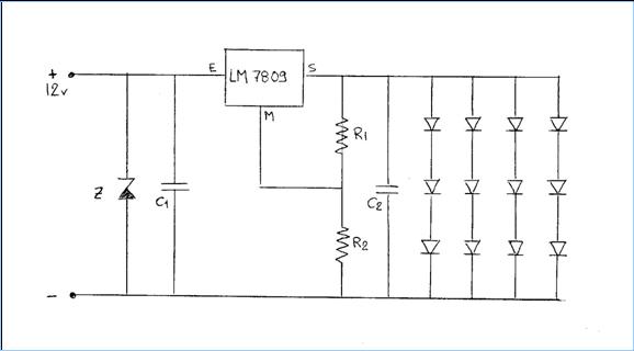 Vu que les leds ont une très longue durée de vie, si leur tension d'alimentation ne dépasse pas certaines limites, et vu que le 12V d'un voilier varie généralement de 12,2 V a 13,8 V, j'ai regule la tension a l'aide d'un régulateur integre LM7809. Sa “masse” est reliée a un pont de résistance R1-R2 qui fixe la bonne tension de sortie: 10,8 V.