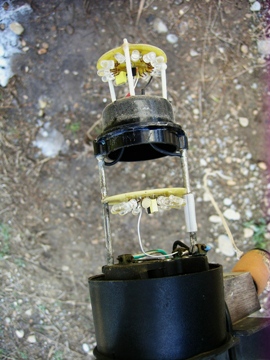 Ces 2 circuits sont montés, collés dans un feu de mat Tridata Perko. J'ai voulu rendre ce montage fixe et soudé, plutôt que de simplement les mettre à la place des culots des ampoules, afin d'éliminer tout mauvais contacts qui sont la plupart du temps la cause de non fonctionnement d'un feu en tête de mat. Il sera toujours possible, si besoin, de revenir au feu Perko d'origine, puisque ses pièces n'