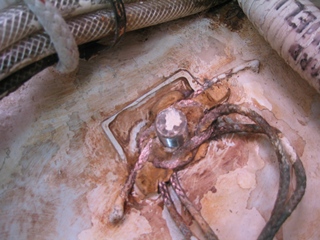 Comme beaucoup de bateaux de série, Boisbarbu a ses tresses de masse coincées dans les rondelles d'un boulon de quille, qui rouillent et se désagrègent après quelques années. Le peu d'eau de mer qui passe dans les fonds finissent par avoir raison du cuivre des tresses de masses.