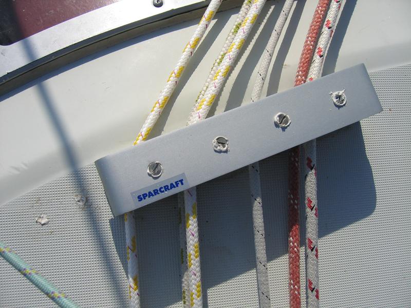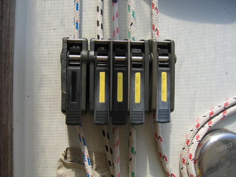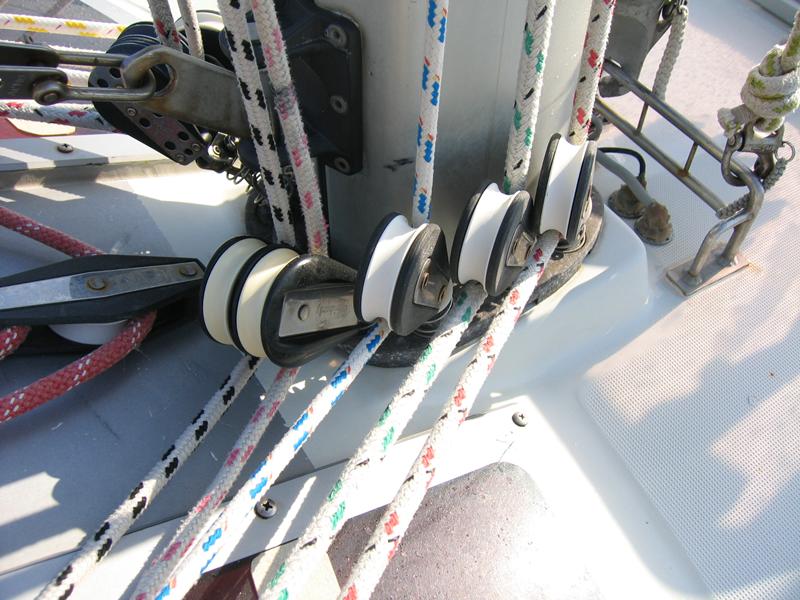 Quelques photos valant mieux qu'un long discours, voici pour chaque bord, 3 photos montrant le gréement courant au pied du mat, sur les boitiers de réas, puis au piano autour de la descente. J'ai évidemment rajouté quelques poulies de pied de mat, boitiers à réas et taquets coinceurs dont 3 taquets Spinlock XT à babord pour soutenir la tension des drisses les plus éprouvées.