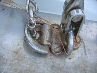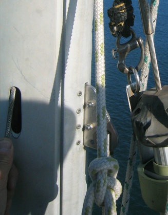 L'étai largable est à environ 30 cm derrière l'étai du génois. Quand il n'est pas installé, l'étai largable et son ridoir est frappé sur une cadène 20cm devant le mat. Pour mettre l'étai à poste, je le frappe sur une estrope qui reste à demeure sur la cadène double. Il n'y a plus qu'à tendre l'étai avec le ridoir à volant. Attention, il faut pendant cet exercice de tension, empêcher le bas du ridoir de tourner afin de ne pas détorroner la rallonge.