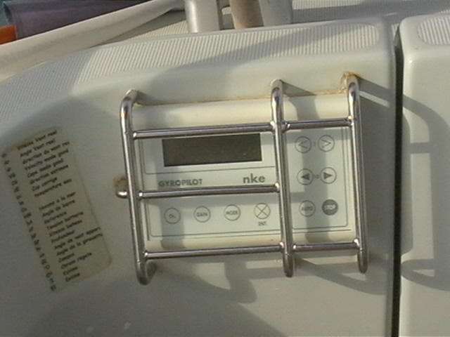Le tableau de commande du gyro-pilote NKE est dans le cockpit, à portée de main du barreur, mais très exposé aux coups de pieds. Je l'ai donc protégé par cette ferrure en inox. Tous les accessoires inox ont été fabriqués par des artisans de Grenoble.