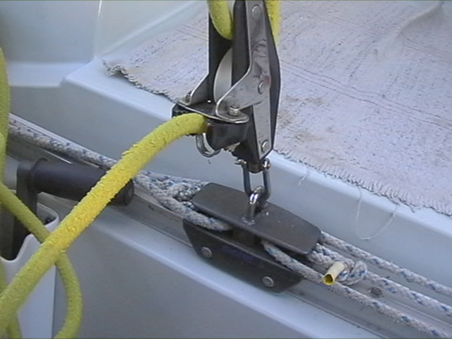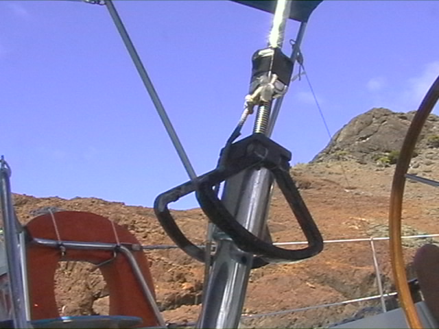 Voici un bout de sandoz tout simple, qui tient la cravate de ris dans le croc, alors que je continue la manuvre de prise de ris depuis le cockpit.