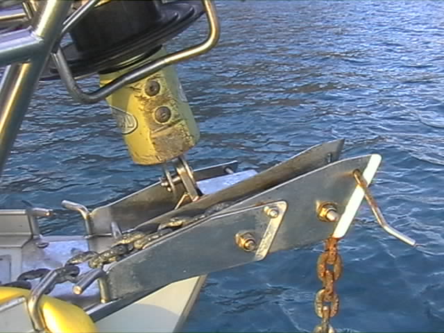 Le davier d'étrave basculant, a du être modifié, à la suite du remplacement de l'étai en Martinique. En effet, l'ajout d'une chape articulée en tête de mat, a abaissé la position de l'enrouleur de génois, limitant ainsi le passage de la chaîne et de l'ancre lors du mouillage. J'ai donc immobilisé le davier pour faciliter le mouillage.