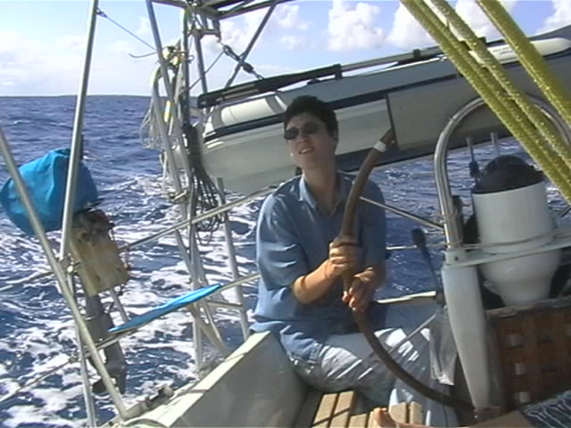 A la suite de la rupture de l'étai en Atlantique, afin de soulager le gréement par vent arrière, pour éviter les claques provoquées par le foc qui se dévente puis se regonfle, nous avons "inventé" l'écoute élastique. L'écoute de foc a été remplacée par une corde d'escalage, amortissant ainsi les chocs. Sous la pression, la corde s'allongeait d'environ 50 cm. C'est assez nul d'un point de vue performance, mais pour la sécurité et la tranquillité d'esprit, quel soulagement.