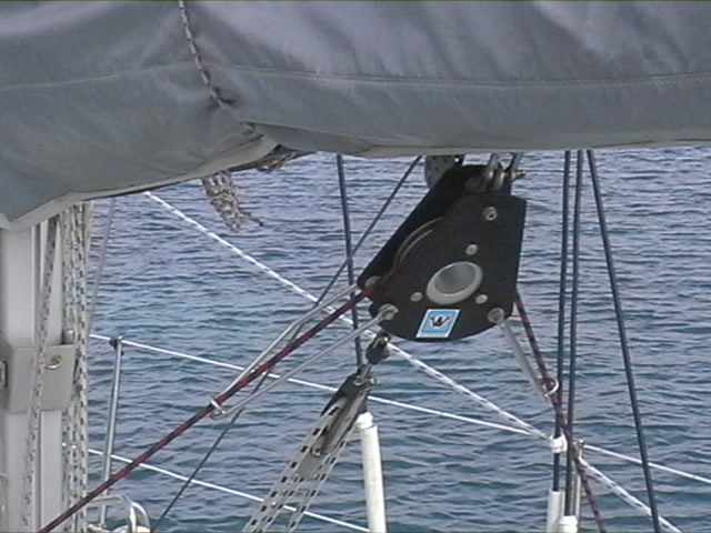 J'ai rajouté ce frein de bome, qui avait été enlevé par le précédent propriétaire juste avant la vente du bateau, ce qui nous avait valu quelques discussions sordides. Ce frein de bome est vraiment un élément de sécurité indispensable à notre type de navigation. Nous nous en servons :