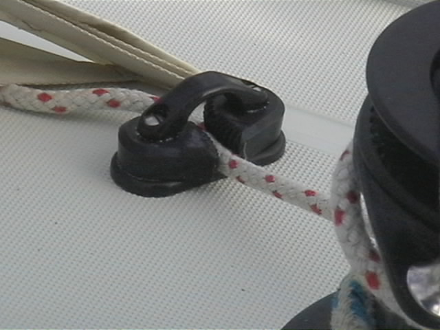 Les coinceurs Spinlock XA, dont était équipé Boisbarbu, étaient très insuffisants (à droite sur la photo). Deux d'entre eux ont explosé lors du convoyage Lorient - Marseille. C'est en ouvrant le taquet sur une drisse sous tension que la joue du coinceur cassait. J'ai donc equipé les drisses de Grand Voile, Génois et Foc 2 de coinceurs Spinlock XT (a gauche sur la meme photo), beaucoup plus fiables et performants. Je n'ai pas eu à regretter ce choix, bien au contraire.