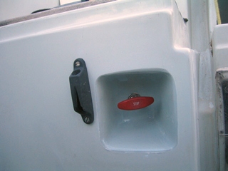 J'ai voulu changer ça, et rendre la commande d'arrêt facilement accessible, tout en la protégeant de la pluie et des chocs. Le meilleur endroit que j'ai trouvé : à bâbord, sous le siège du barreur, en arrière du panneau de contrôle du moteur.