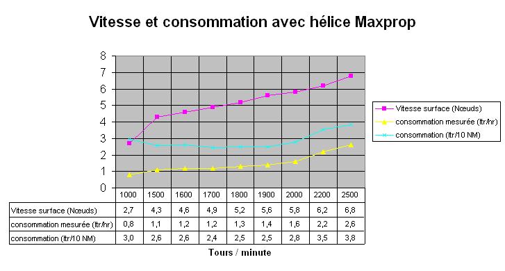 Certaines cases des tableaux sont encore incomplètes, mais incidemment on y voit également la vitesse en fonction du régime moteur, sur mer plate, sans vent, avec une carène propre. La consommation avec la MaxProp semble être la même qu'avec la Radice.