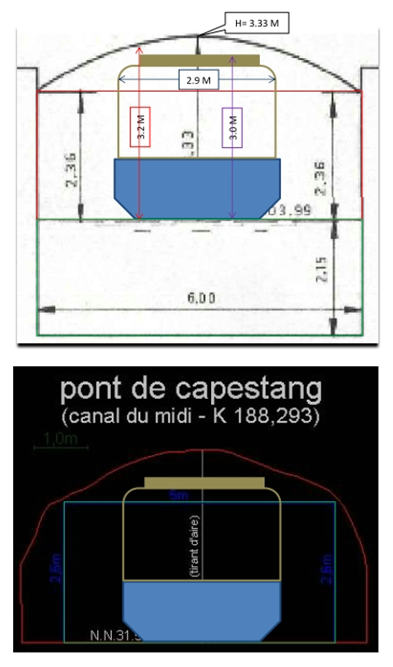 Je vais aussi le modifier pour pouvoir démonter le haut car je ne passe pas sous le pont de Carcassonne (canal du midi) à quelques centimètres près. Ca devrait intéresser des personnes qui voudraient faire le canal mais qui sont bloquées par la hauteur des ponts. 3.3 maxi et 2.4 m de haut à 2.5 m de l'axe du pont. Voici les dimensions exactes pour le passage du pont