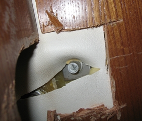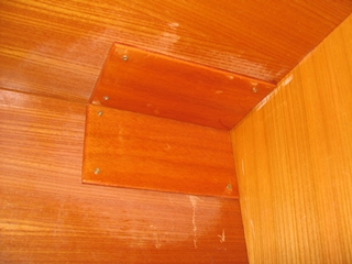 Après avoir dégagé les 2 rivets par dessous, et les avoir remplacé par 2 boulons de 6x30 à tête fraisée sur la contreplaque existante et 2 rondelles, je cache les dégats de l'équipet cuisine. Un petit coup de vernis, et aujourd'hui on ne s'en rend plus compte. Les 2 boulons avaient évidemment été noyés dans du Sika 291 pour l'étanchéité.