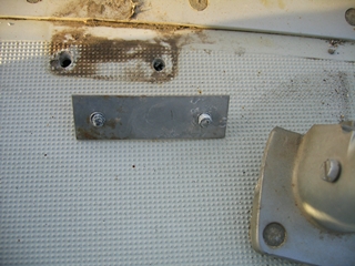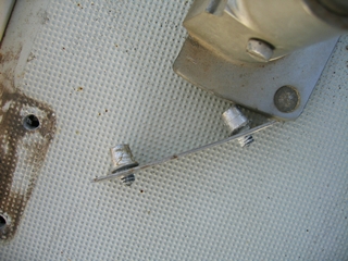 Après le "débordage" un peu insistant d'un voisin, le pied d'un chandelier babord s'était extrait du pont. Les rivets de fixation avaient cédé.