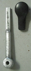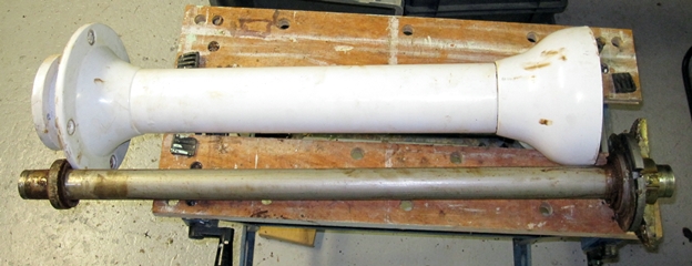 La colonne de barre et son tube, côte à côte. On voit en haut du tube, la clavette qui tient l'engrenage sur le tube.