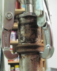Arrachage du roulement inférieur. On voit le roulement particulièrement rouillé et détruit. Il est difficile à sortir, même avec l'arrche moyeu.