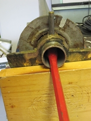 Puis l'arrache moyeu permet de pousser le tube vers le haut, hors de la cage à roulement sous la colonne de barre.