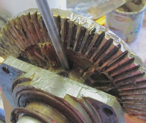 L'extraction de la roue dentée puis du roulement à bille supérieure est plus délicate, puisqu'on n'a pas 3 points d'appui pour l'arracheur.