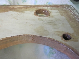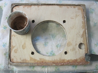 La peinture du puit de compas, du plateau et de la colone de barre est défraichie. Il y a même des cloques sur la colonne que je repeins après l'avois traité au primaire époxy (5 couches).