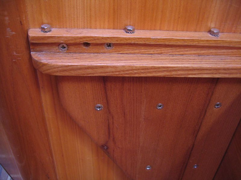 J'ai d'abord recoller, puis renforcé avec des boulons la glissière. Comme ce n'était pas suffisant, j'ai soutenu la glissière avec une pièce de bois. En orme, cette pièce rapportée, vissée à la cloison de l'évier, s'intègre bien dans l'esthétique du meuble.