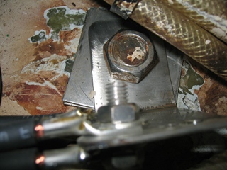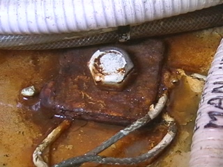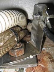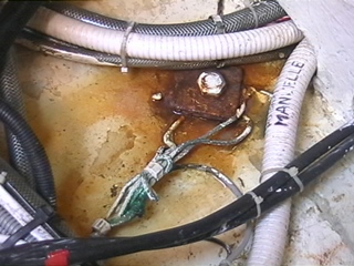 Afin d'éviter la tresse mal protégée et baignant dans l'humidité, j'ai remplacé les tresses par du câble souple multibrins, tous les câbles étant reliés par de solides cosses à une grosse cosse en inox vissée sur un boulon de quille. L'ancienne tresse était de section carrée, de 25 mm2.