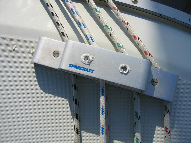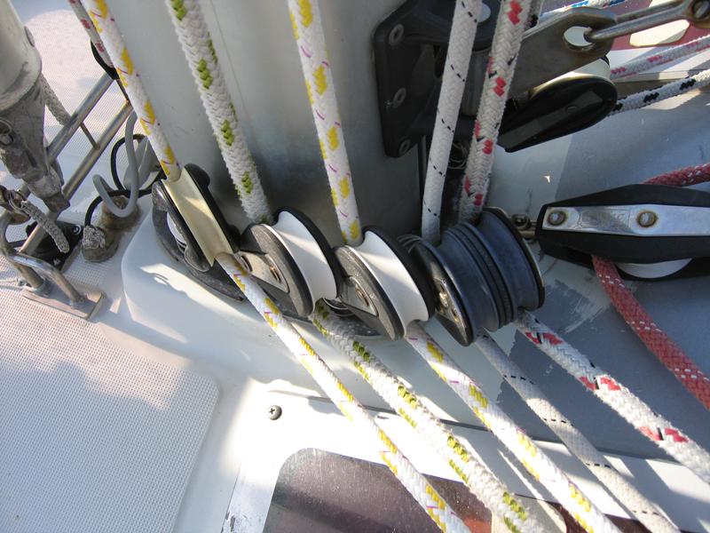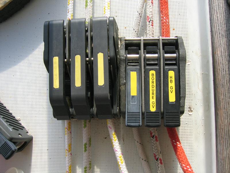 Quelques photos valant mieux qu'un long discours, voici pour chaque bord, 3 photos montrant le gréement courant au pied du mat, sur les boitiers de réas, puis au piano autour de la descente. J'ai évidemment rajouté quelques poulies de pied de mat, boitiers à réas et taquets coinceurs dont 3 taquets Spinlock XT à babord pour soutenir la tension des drisses les plus éprouvées.