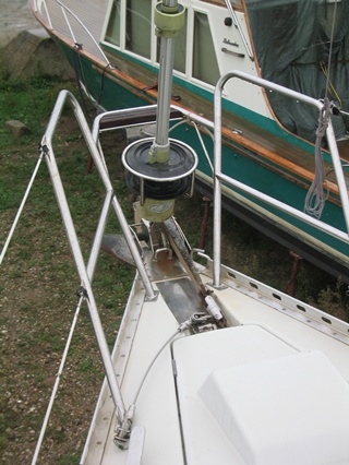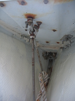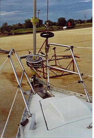 L'étai largable est à environ 30 cm derrière l'étai du génois. Quand il n'est pas installé, l'étai largable et son ridoir est frappé sur une cadène 20cm devant le mat. Pour mettre l'étai à poste, je le frappe sur une estrope qui reste à demeure sur la cadène double. Il n'y a plus qu'à tendre l'étai avec le ridoir à volant. Attention, il faut pendant cet exercice de tension, empêcher le bas du ridoir de tourner afin de ne pas détorroner la rallonge.