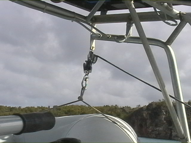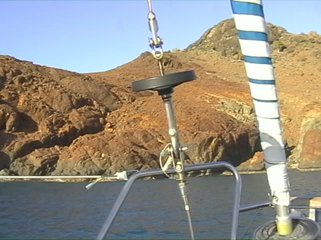 J'ai également failli couper le pataras par 2 isolateurs électriques afin de s'en servir d'antenne pour la radio BLU. Je ne regrette pas de ne pas avoir fait effectuer cette coupure, qui m'aurait laissé un doute sur sa solidité. L'antenne BLU est donc un simple câble électrique tressé, qui part du portique arrière et est renvoyé sur une petite poulie en tête de mat. Et ça marche très bien comme ça.