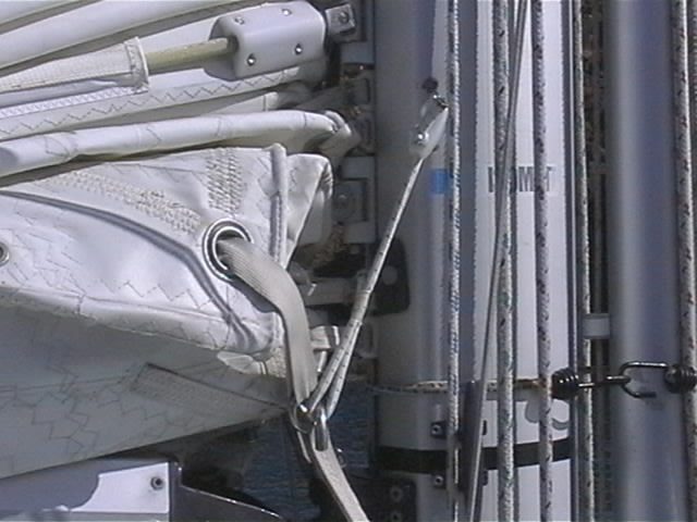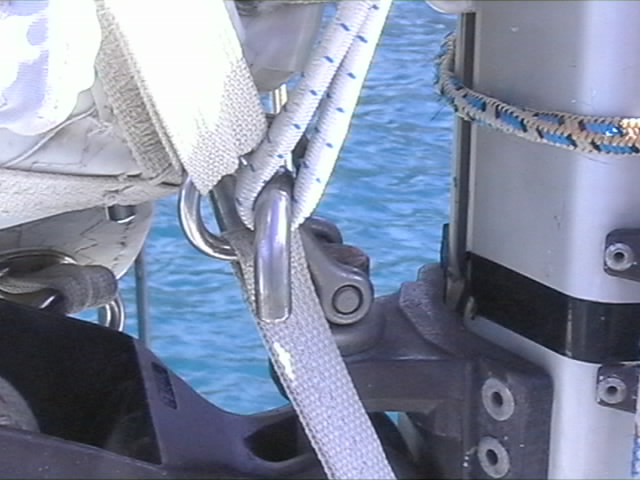 Voici un bout de sandoz tout simple, qui tient la cravate de ris dans le croc, alors que je continue la manuvre de prise de ris depuis le cockpit.