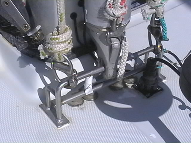 J'ai fait faire cette ferrure de pied de mat pour frapper les drisses de foc 2 et de spi, ainsi que le tangon. Cet accessoire est extrêmement utile. Le tangon mate n'encombre pas le pont et permet de préparer la manuvre du spi très facilement. En effet, sans changer le réglage de la balancine de tangon (toujours a poste), il suffit de faire descendre la cloche de tangon, pour amener le tangon a l'horizontale.