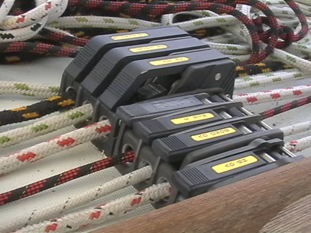 Les coinceurs Spinlock XA, dont était équipé Boisbarbu, étaient très insuffisants (à droite sur la photo). Deux d'entre eux ont explosé lors du convoyage Lorient - Marseille. C'est en ouvrant le taquet sur une drisse sous tension que la joue du coinceur cassait. J'ai donc equipé les drisses de Grand Voile, Génois et Foc 2 de coinceurs Spinlock XT (a gauche sur la meme photo), beaucoup plus fiables et performants. Je n'ai pas eu à regretter ce choix, bien au contraire.