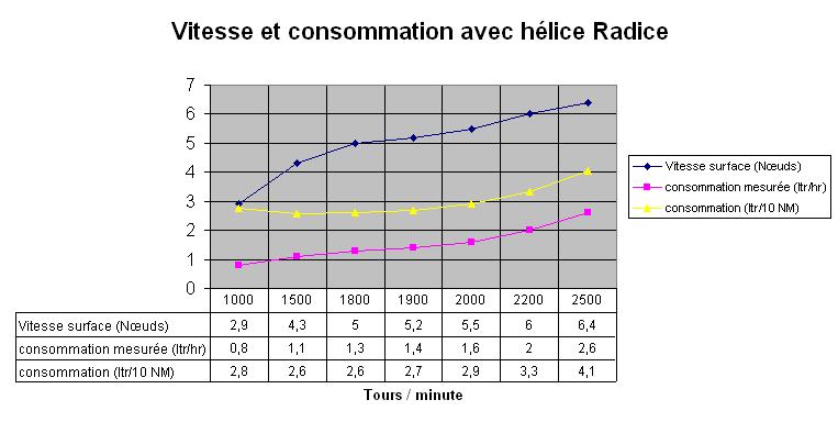 Certaines cases des tableaux sont encore incomplètes, mais incidemment on y voit également la vitesse en fonction du régime moteur, sur mer plate, sans vent, avec une carène propre. La consommation avec la MaxProp semble être la même qu'avec la Radice.