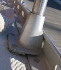 Après le "débordage" un peu insistant d'un voisin, le pied d'un chandelier babord s'était extrait du pont. Les rivets de fixation avaient cédé.