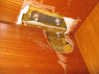 Après avoir dégagé les 2 rivets par dessous, et les avoir remplacé par 2 boulons de 6x30 à tête fraisée sur la contreplaque existante et 2 rondelles, je cache les dégats de l'équipet cuisine. Un petit coup de vernis, et aujourd'hui on ne s'en rend plus compte. Les 2 boulons avaient évidemment été noyés dans du Sika 291 pour l'étanchéité.